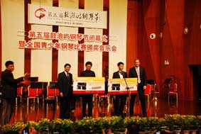 青年組第一名于紋聽(tīng)(右二)、少年組第一名郝一雷(左一)分別獲得了德國(guó)博蘭斯勒鋼琴有限公司頒發(fā)的價(jià)值5萬(wàn)元的鋼琴獎(jiǎng)勵(lì)。