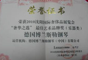 2010年1月8日-10日,德國國寶—博蘭斯勒鋼琴公司作為主 辦方的特約品牌出席了2010年沈陽國際奢侈品展,受到熱捧的德 國國寶—博蘭斯勒不僅是專業(yè)院校的最佳之選,更是奢侈品的頂級 之選。