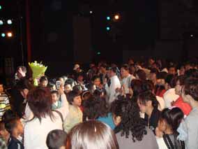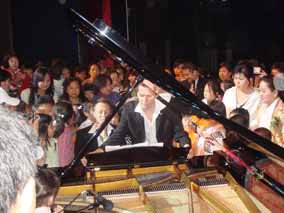 當(dāng)晚演出行至終場(chǎng)時(shí),“歐米勒孖寶”退至幕后。精彩的演出 令在場(chǎng)觀眾尤為留戀,他們極力拍手、瘋狂呼喊“孖寶、孖寶”。 當(dāng)“歐米勒孖寶”重返舞臺(tái)時(shí),在場(chǎng)觀眾再也按耐不住內(nèi)心的欣喜 之情,紛紛涌上舞臺(tái),欲將“歐米勒孖寶”久久的留在舞臺(tái),共享 音樂之美?!皻W米勒孖寶”為全場(chǎng)觀眾的喜悅為感動(dòng),于是,舞臺(tái) 上人山人海,觀眾們互相簇?fù)碇?,鮮花與掌聲將“歐米勒孖寶”環(huán) 抱著,“歐米勒孖寶”在這個(gè)特殊“舞臺(tái)”上為觀眾們?cè)俅潍I(xiàn)上精 彩表演,現(xiàn)場(chǎng)觀眾們的喝彩聲、現(xiàn)場(chǎng)相機(jī)鏡頭搶拍聲不絕于耳。 歐米勒孖寶 2008 鋼琴也瘋狂中國(guó)巡演