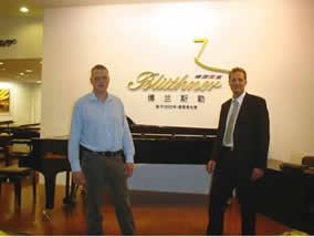 5月7日,德國(guó)博蘭斯勒(Blüthner)鋼琴公司總裁Dr.ChristianBlüthner-Haessler(中文名博思進(jìn))及技術(shù)總監(jiān)Mr. Knut Blüthner-Haessler(中文名博立德)抵達(dá)廣州,視察廣州新工廠與中國(guó)第一家博蘭斯勒鋼琴標(biāo)準(zhǔn)展示店。