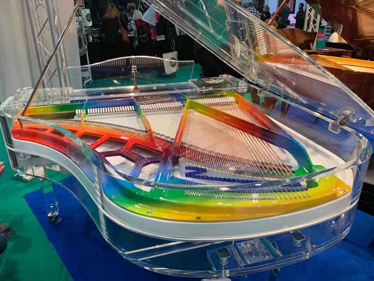 在現(xiàn)場眾多令人目不暇接的常規(guī)型號與定制型號中,最為奪人眼球的莫過于現(xiàn)場的一架博蘭斯勒水晶詩意定制系列——“彩虹之上”。區(qū)別于市面上其他的水晶鋼琴,Blüthner重新定義了如何打造一架真正完全透明的三角鋼琴。摒棄了所有厚重的木支架與不計其數(shù)的略顯古板的螺栓,以全透明材質(zhì)打造。除了鋼琴的音板之外,從鋼琴的頂蓋、外框、音板邊框到所有的鍵盤檔、琴譜架、琴鍵蓋、琴腿均有透明材質(zhì)精心打磨而成。透過晶瑩通透的琴身,如同陽光照射通過了晶瑩靈動的水滴,光線被折射在天空上形成七彩的光譜——展現(xiàn)在面前的是宛如盛滿了七彩顏料水彩畫板的鐵支架。