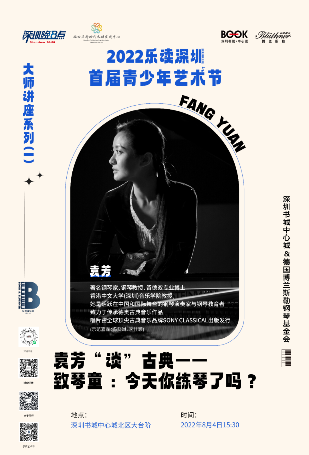 2022深圳樂讀·首屆青少年藝術(shù)節(jié)首場預(yù)熱講座即將于8月4日下午15:30于深圳書城中心城舉行。首場講座,我們將迎來著名鋼琴家、鋼琴教育家袁芳!
